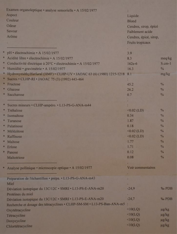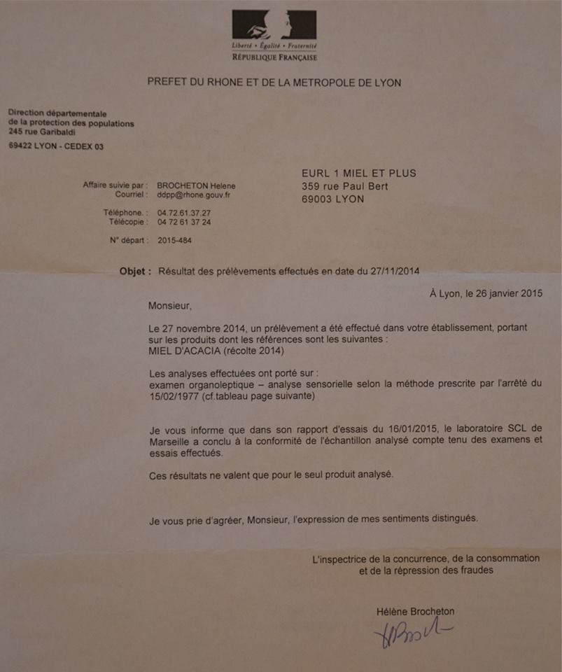 Mais heureusement pour vous je suis là !!! et moi aussi j’ai été contrôlé par la DGCCRF et je vous en joint le résultat ! Naturellement conforme car chez moi le miel c’est entre vous et moi et c’est tout !!!